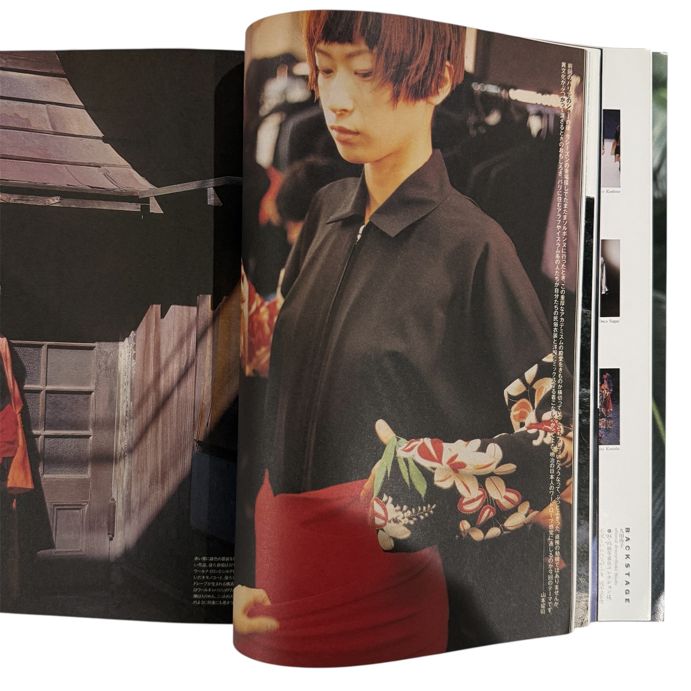 ヨウジヤマモトの特集では94-95秋冬東京コレクションのバックステージに密着。ジャポニズムをテーマにしたショーで、それまで数多のデザイナーが挑むも大成功とはいかず、一種のタブーともされていた着物へ挑戦し、結果西洋と東洋が一体化した名作とされるシーズンとなりました。併せて、スパイラルホールで行われた山本耀司の講演の質疑応答を掲載。コムデギャルソンや川久保玲についても語っており興味深いです。