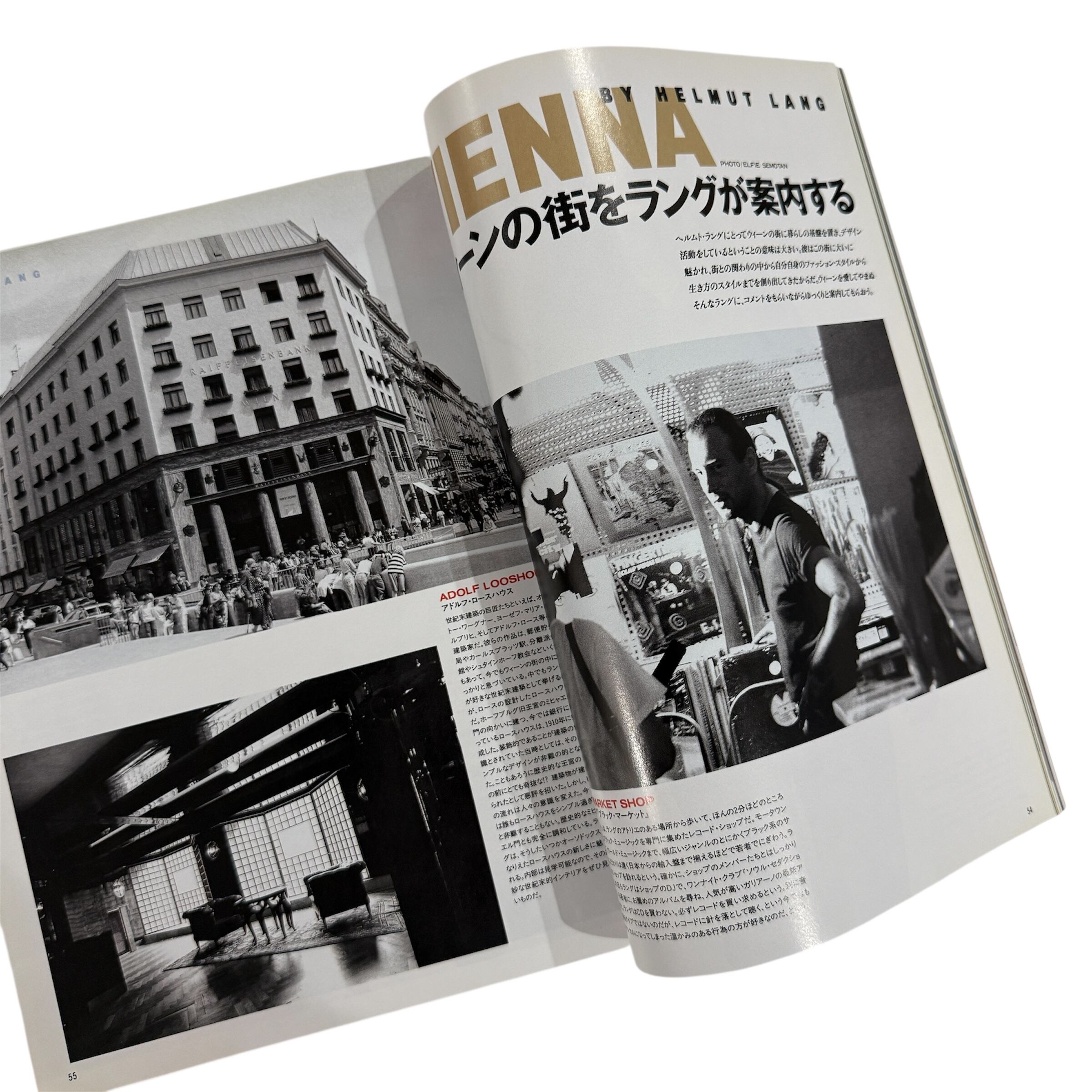 ヘルムート・ラングを特集した流行通信。インタビューではラング本人の生い立ちからクリエイションまで幅広く語られる中、彼は生まれ故郷でもあるウィーンの街や街中の建築などからも影響を受けたようで、そういったこともあってか、記事の後半にはラング本人によるウィーンのショップや建築案内の記事も掲載されています。また、プレスやアシスタント、写真家など彼のクリエイションを支える近しい友人のインタビューも掲載。本人によるファッションイメージなどと併せてヘルムート・ラングを深く知るのに良い1冊。その他ビューティー特集や佐野元春のインタビュー等。